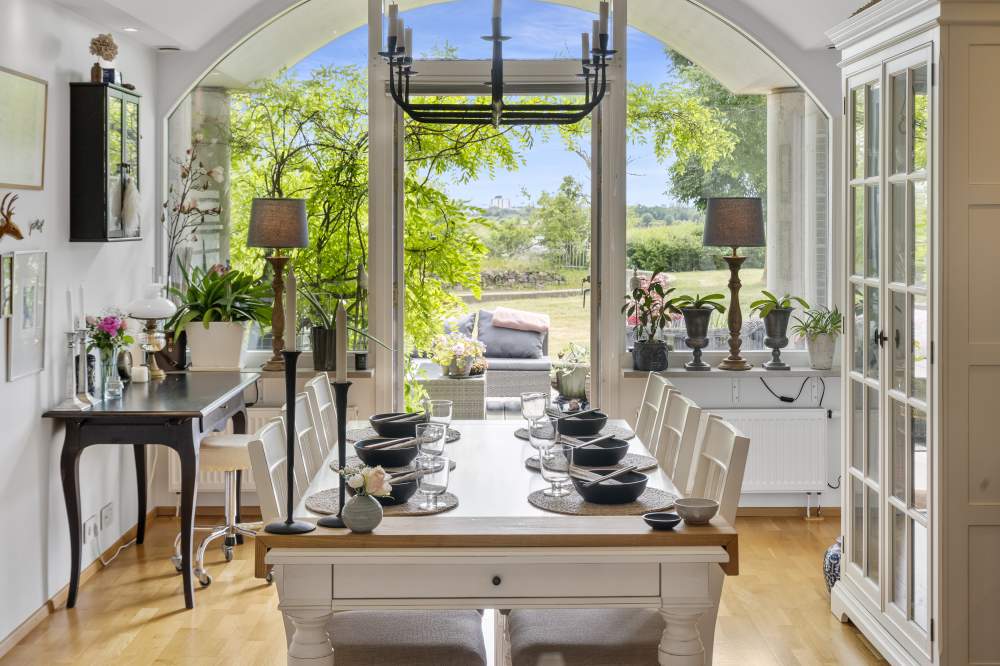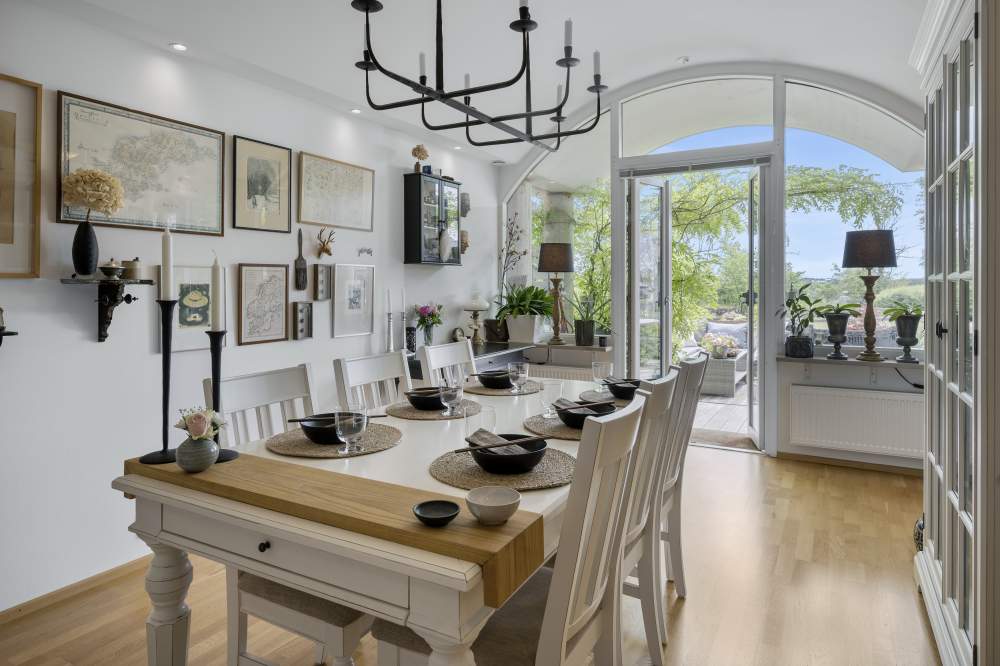 MATSAL: Ekparkett och vita väggar, tak spotlights och extra takhöjd. Fönster och utgång till uteplats i söderläge. Rummet är väl tilltaget och i öppen planlösning med kök.