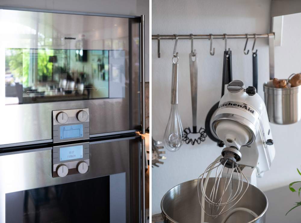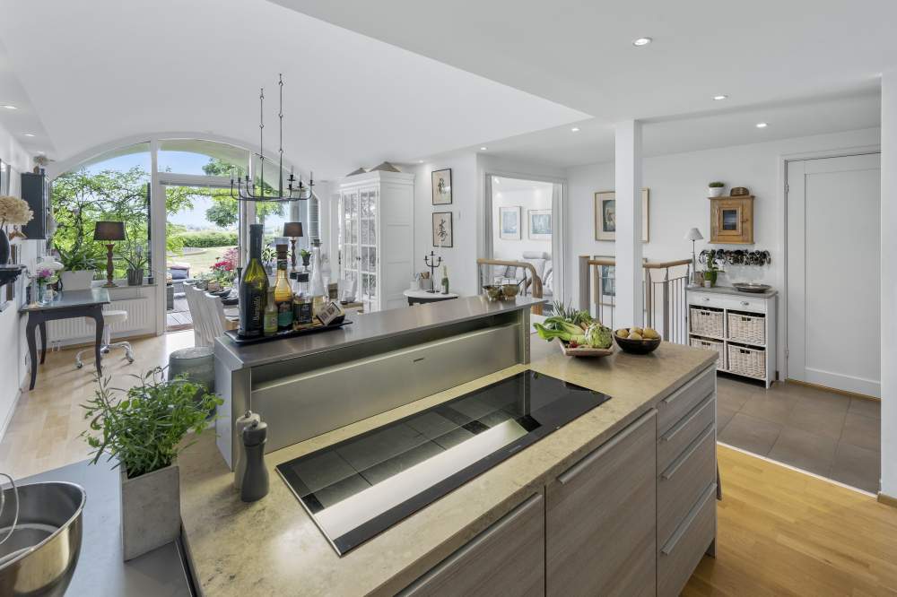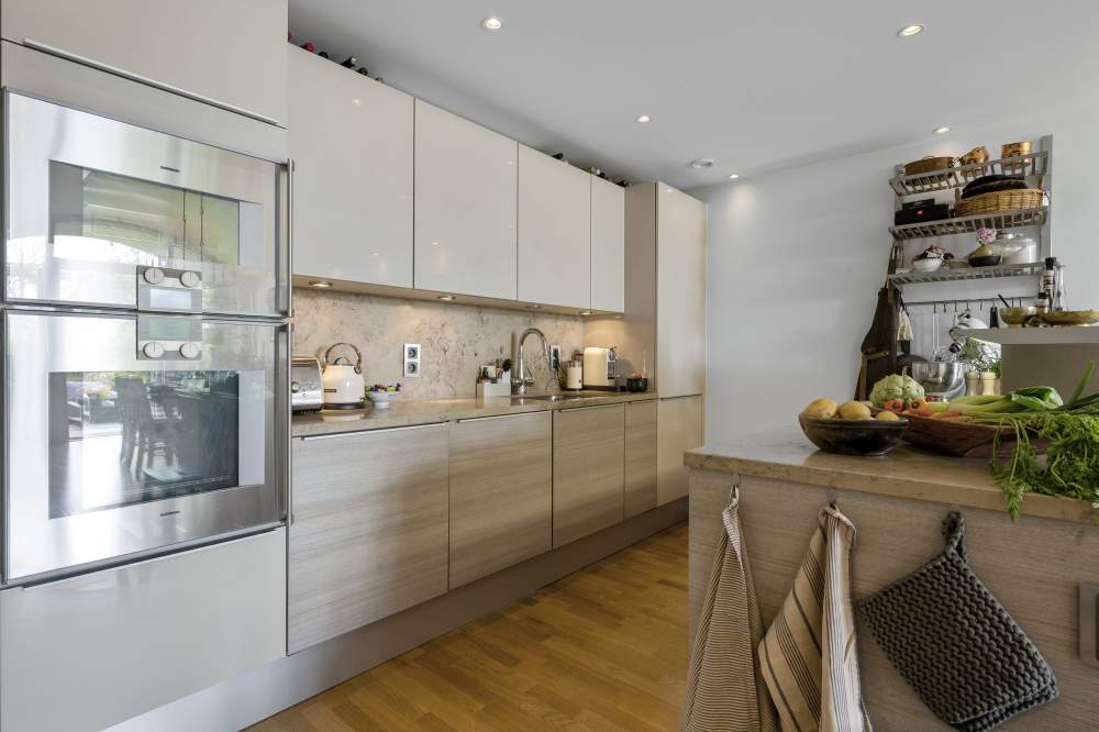 KÖK: Ekparkett och vita väggar, tak spotlights och fönster mot söder. Inredning Poggenpohl i äggskalsvitt med beigegrå stenbänk och stänkskydd. Köksö med spishäll och fläkt. Utrustning: spishäll, fläkt (Gaggenau), integrerad kyl/frys samt diskmaskin (Siemens). Inbyggnadsugn och även en andra ugn som är kombinerad med ånga (Gaggenau). Öppen planlösning mot matplats som rymmer större sällskap och vy mot uteplats.
