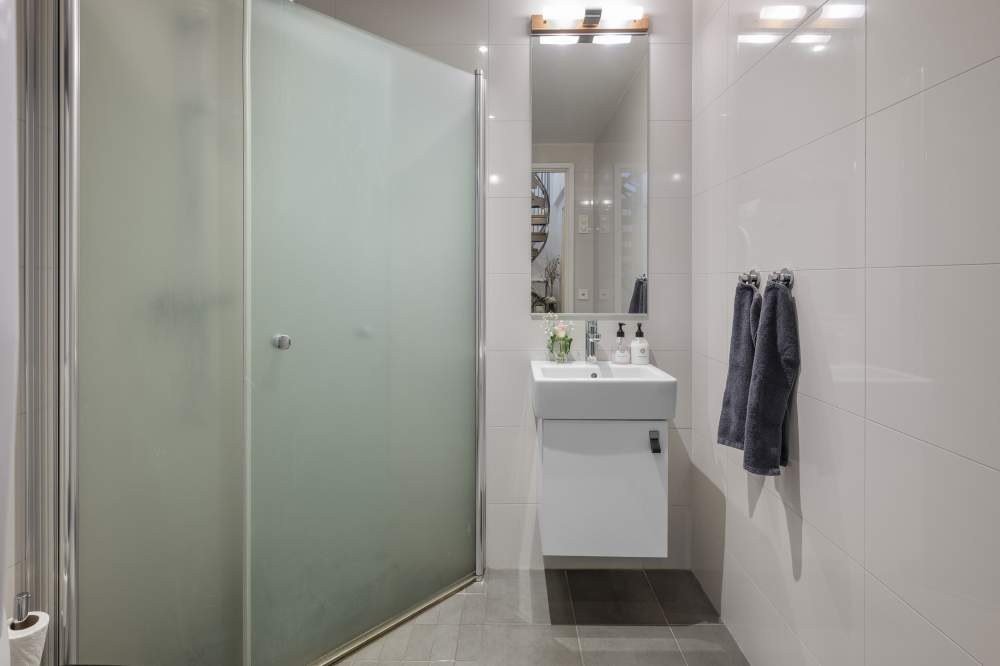 BADRUM 2: Grått klinkergolv, ljus kakel på väggar och tak spotlights. Utrustning: vägghängd toalett (Ifö), vitt handfat, vit kommod med skåp och väggspegel. Dusch med duschväggar. Frontmatad tvättmaskin (Siemens, 2009), frontmatad torktumlare (Siemens, 2009). Sensorbelysning.