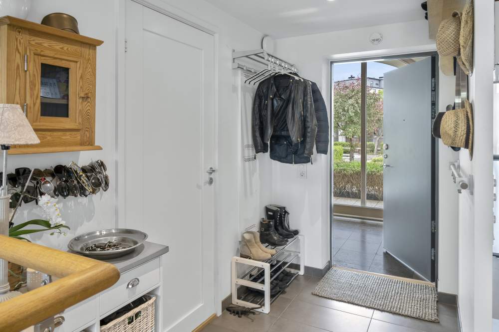 HALL: Egen ingång/utgång. Ekparkett och vita väggar.