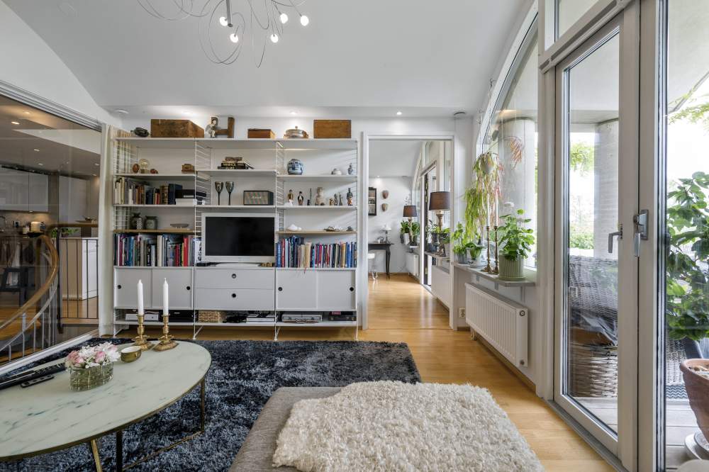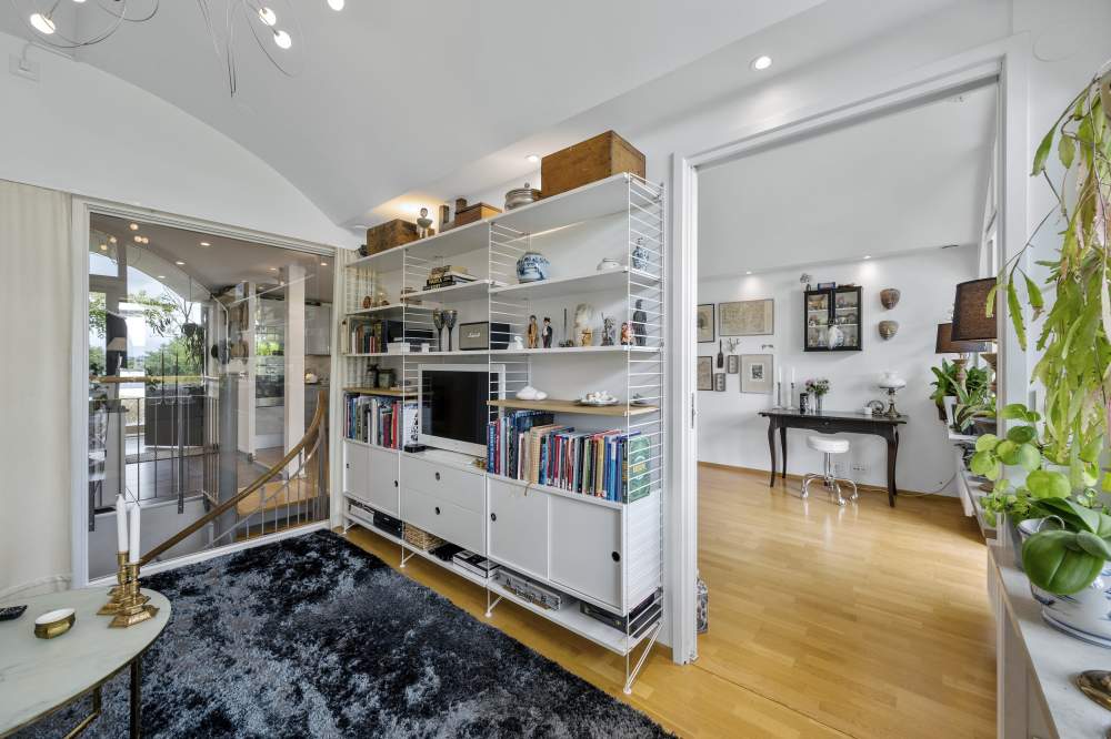 Modern smakfull skandinavisk stil i ljusa färger. De stora fönsterpartierna och ljusbrunnarna ger ljusinsläpp året om samtidigt som bottenvåningens öppna planlösning ger en känsla av rymd. Ekparkett i samtliga boendeutrymmen förutom badrum och entré. Mycket hög kvalitet i inredning och materialval.Bottenvåning