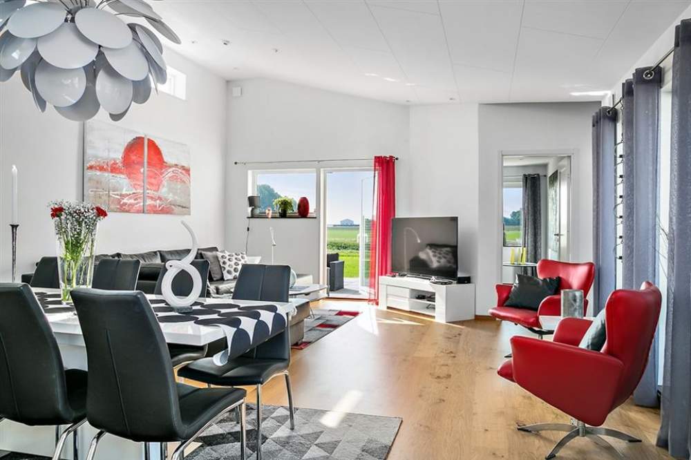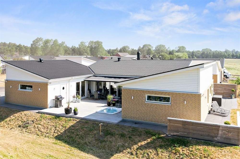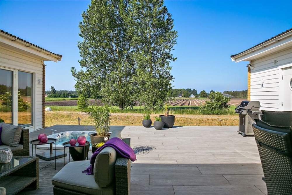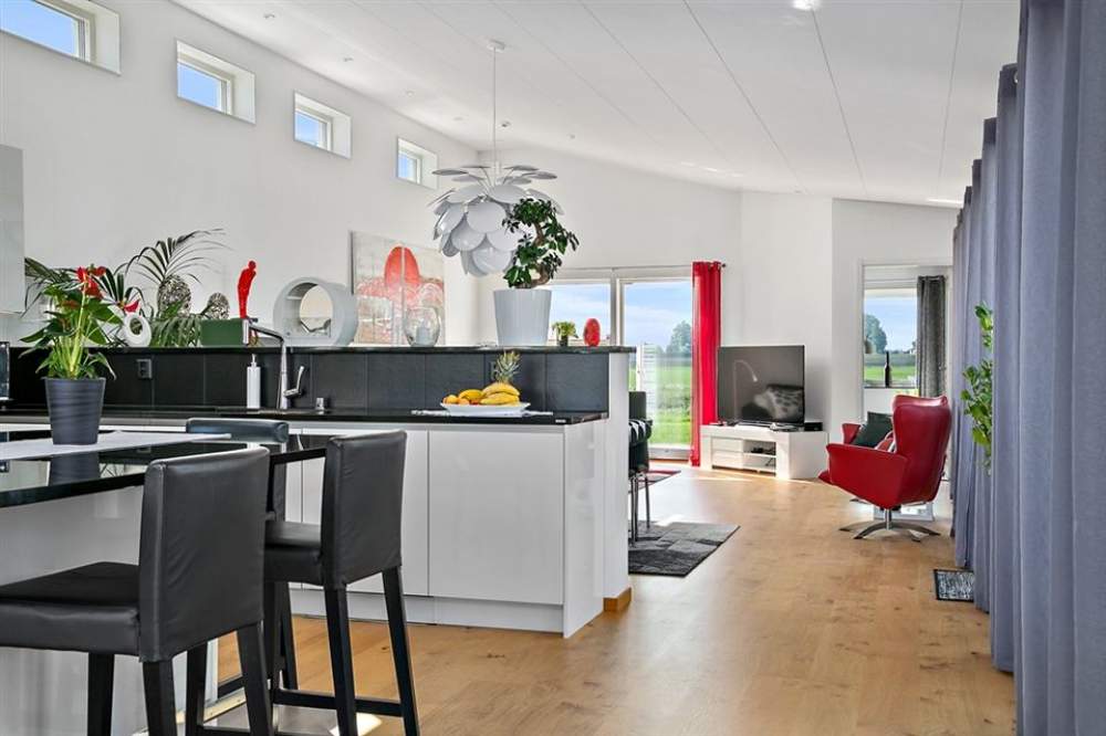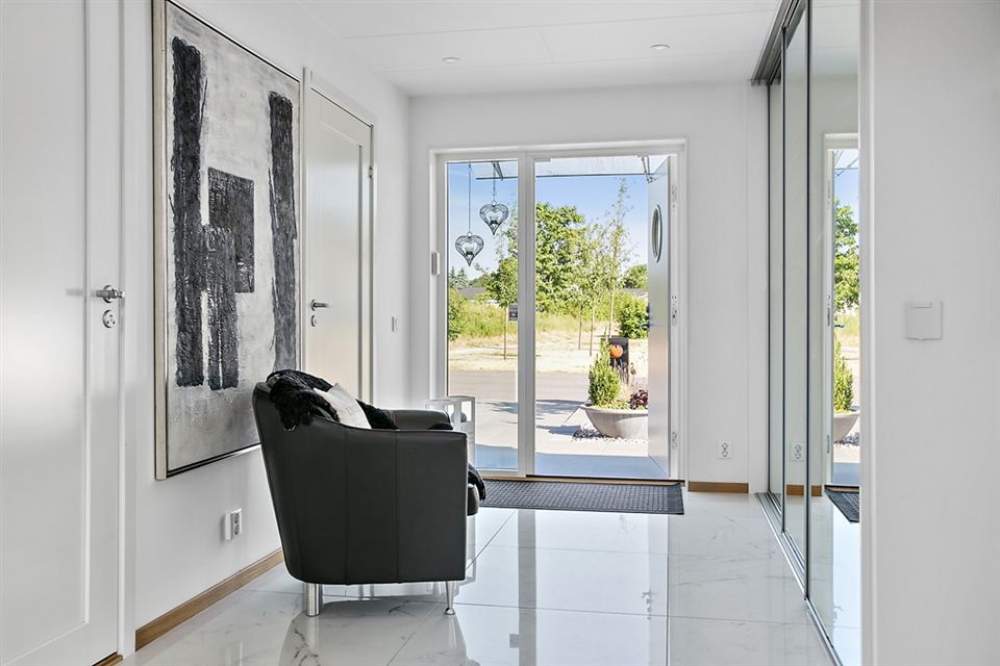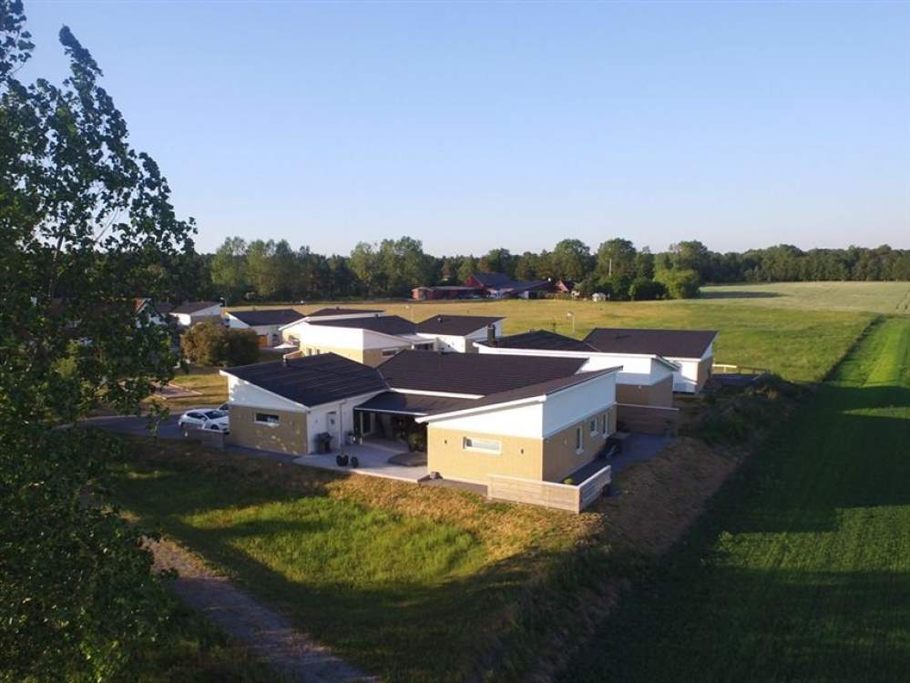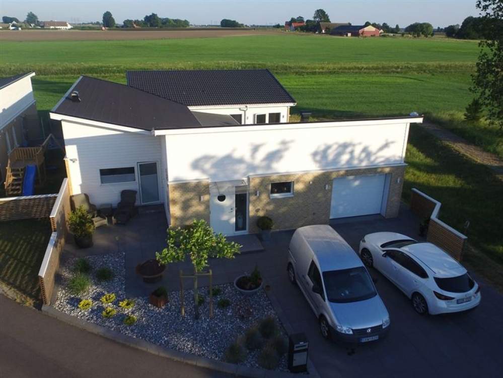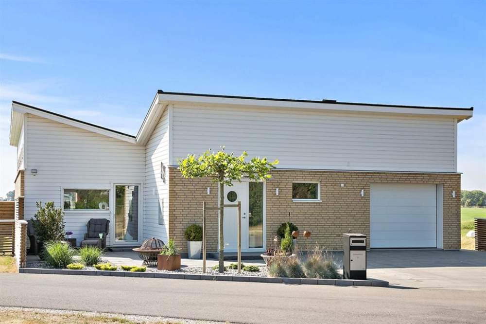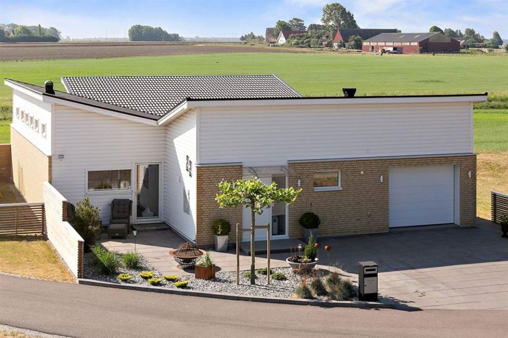 Här erbjuds man ett modernt energisnålt boende som ger mycket god driftsekonomi samtidigt som det kräver ett minimalt underhåll. Påkostade materialval och genomtänkt extrautrustning kompletterar funktionalismen. Bostaden har en öppen social planlösning med ett elegant och arbetsmässigt väl anpassat kök med stor köksö och bänkskivor i granit. En stor sällskapsyta med plats för såväl många middagsgäster som för den rejäla soffgruppen. De stora fönster partierna i kombination med takhöjden ger en fantastisk känsla av ljus och volym. Fortsätter man längre in i huset kommer man till den privata delen med Master bedroom och intilliggande walk in closet samt badrum med dubbla duschar. I denna delen finner man också ett ytterligare sovrum som även kan användas som gästrum alternativt kontor. Bostaden erbjuder också goda förvaringsmöjligheter och, förutom det stora integrerade garaget, både ytterligare biluppställningsplatser och separat intilliggande gästparkering. Uteplatser i tre väderstreck gör att man kan följa solen och vinden. Den största utgörs av en öppen atrium gård där den fjärrstyrda stora markisen kan bilda tak och ge skugga över däcket bestående av exklusiv underhållsfri klinkerkeramik. Här finns också den nersänkta jacuzzin av högsta kvalitet där upp till 5 personer kan bada året om helt utan insyn. Med fälten som granne i söder och väster och den ursprunglige markägarens gamla gård mitt emot skapas avskildhet i området och en charmig omgivning. Till detta kan läggas ett utmärkt läge med närhet till de större städerna i Öresundsregionen, golfbanor, strövområden, all service, dagis och skolor.