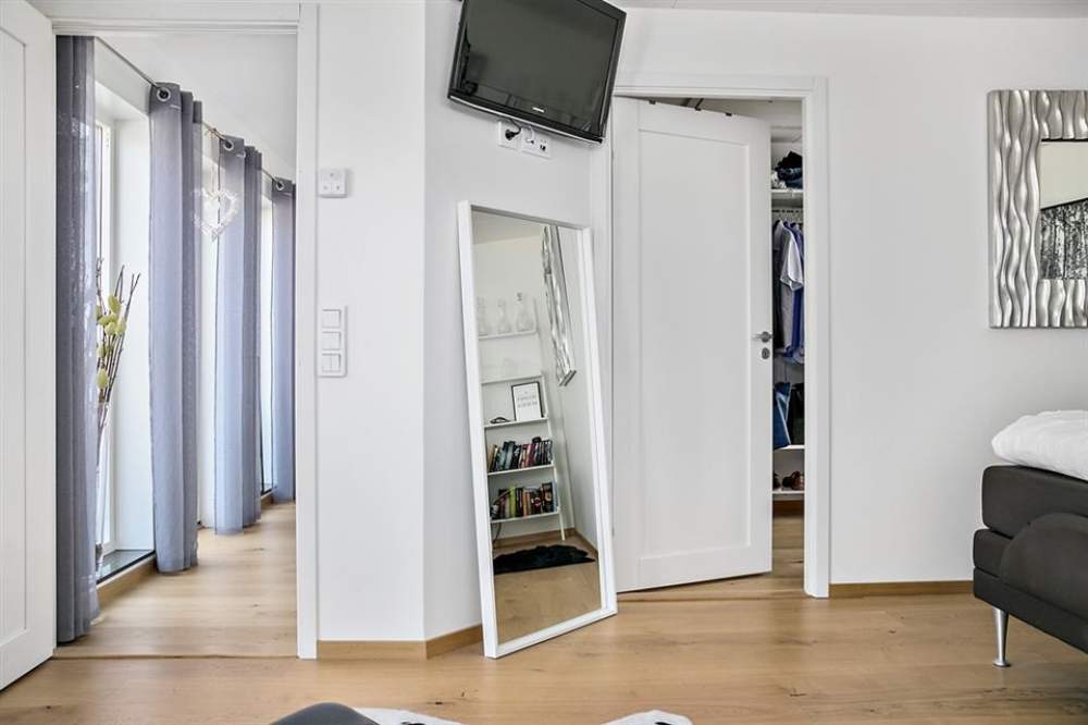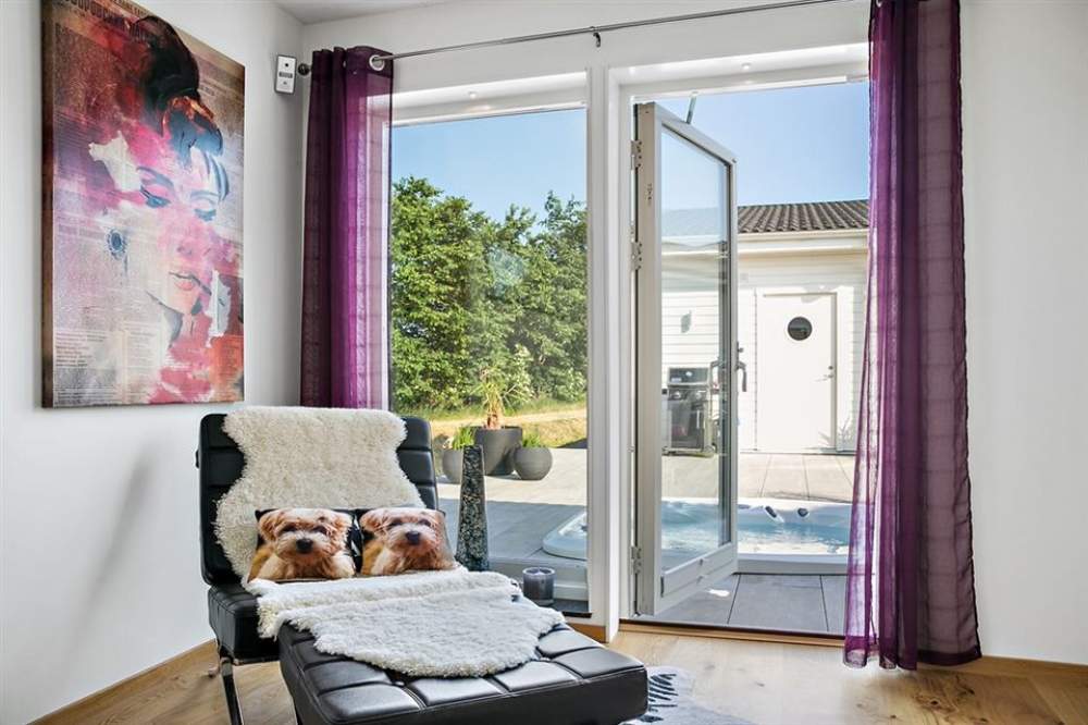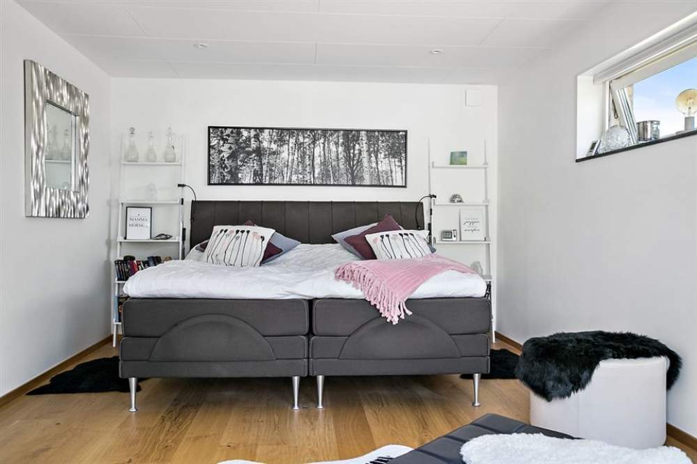 SOVRUM 2 Master bedroom: Ekgolv. Stora fönsterpartier samt utgång till terrassen. Härifrån når man också intilliggande walk in closet.
