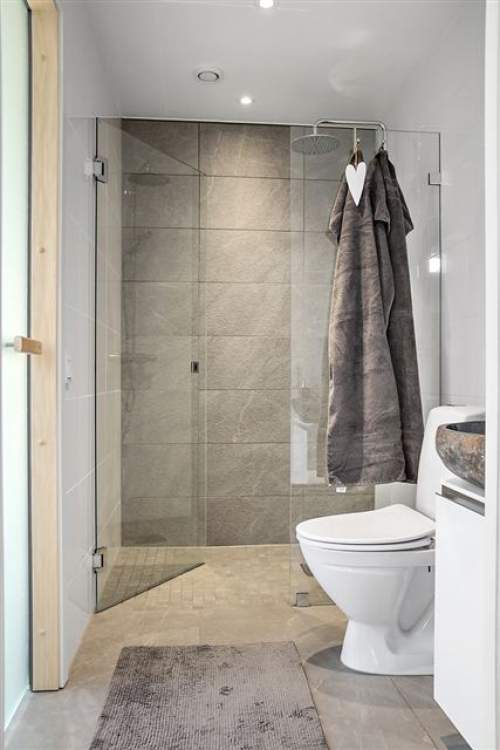 BADRUM 1: Grå klinker på golv och vit kakel på väggar samt fondvägg av antracitgrå större kakelplattor.