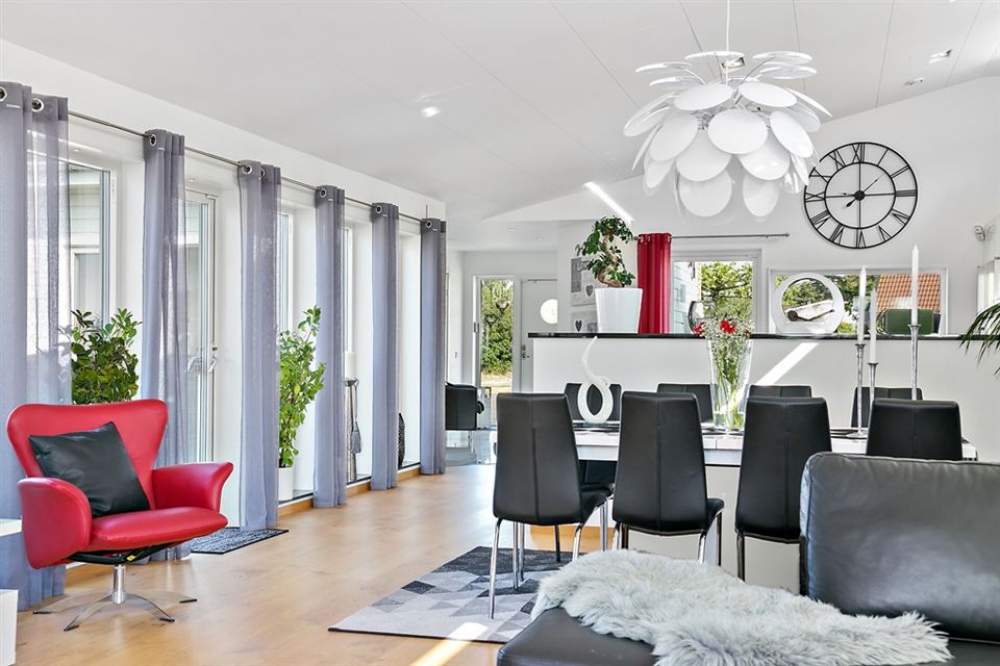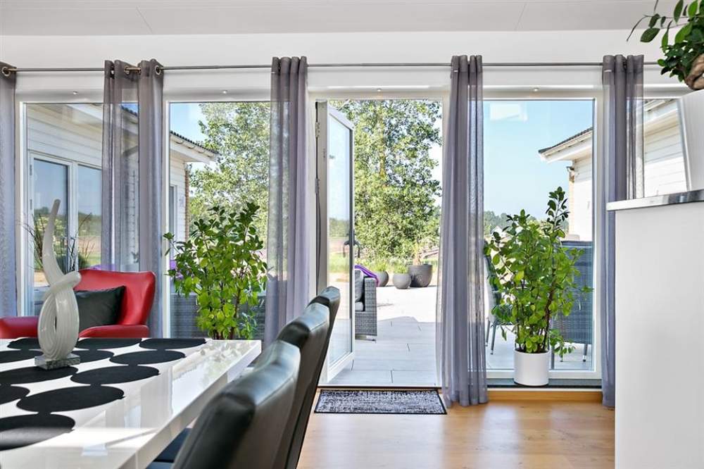 VARDAGSRUM: Stora fönster och glaspartier mot uteplatsen samt mindre fönster längs motstående vägg. Utgång till såväl den stora terrassen som den mindre uteplatsen på huset baksida. Golv av Kährs ek med bred enstav.