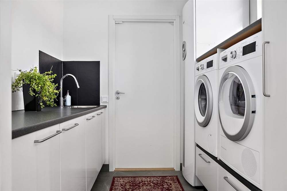 GROVKÖK: Antracitgrå klinker på golv. Vita väggar. Tvättmaskin samt torktumlare av märket Bosch. Tvättho (underlimmad). Arbetsbänk.