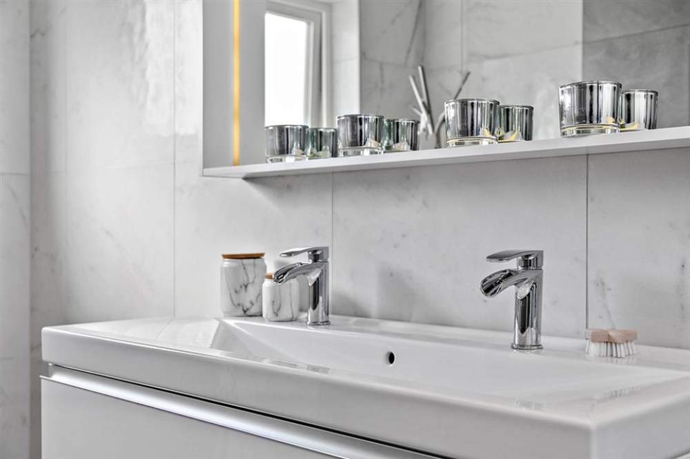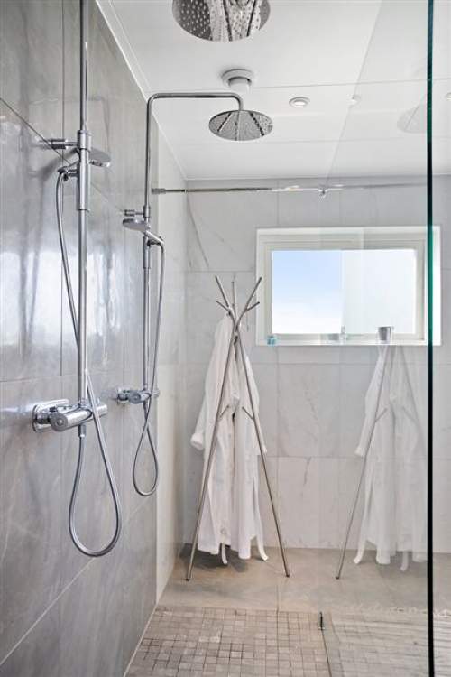 BADRUM 2 Master bathroom: Stora grå marmorerade ljusa klinker på golv och vit kakel med grått dekor parti på väggar. Inredning av märket Ballingslöv i vitt med spegel med belysning ovanför dubbeltvättställ med "vattenfalls" kranar och kommod. Separat tillhörande hög skåp. Dubbla duschar bakom hel glasvägg.