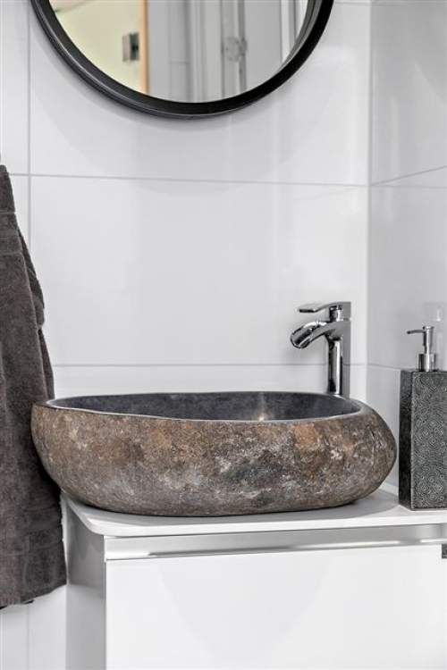 Inredning bestående av designat tvättställ i sten samt tillhörande kommod. Dusch och WC.